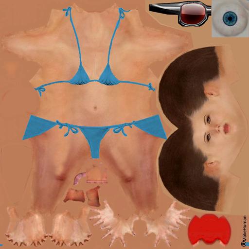 Les modèles créés à l'aide de MH comportent plusieurs textures séparées : celle du corps (y compris tête), des yeux, de la chevelure éventuelle, des habits, etc... Dans notre objectif de réduire au maximum les ressources utilisées pour l'affichage, mon choix a été de regrouper autant que possible tout sur une même texture. Ci-dessous par exemple la texture d'une baigneuse où j'ai tout regroupé : corps, visage, maillot, yeux et lunettes.