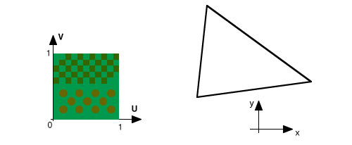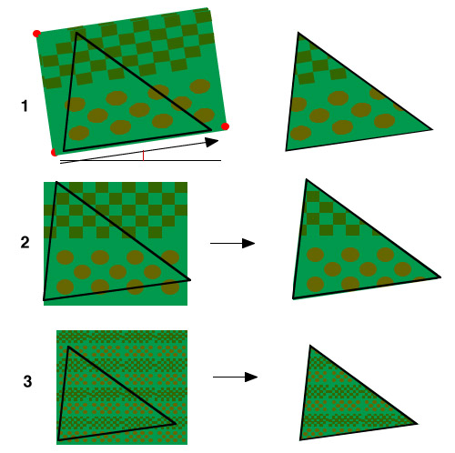Plaquer une texture sur un polygone, c'est la mettre en place comme on collerait une photo sur un album (avec la possibilité de l'agrandir, de la rétrécir ou de la déformer), le polygone étant alors la page de l'album. On considère que la texture est définie dans un espace à deux dimensions (U,V au lieu de dire x,y) de 0 à 1. Plaquer la texture c'est donner les paramètres nécessaires pour positionner cet espace UV dans celui du polygone. Pour simplifier on suppose le polygône plan.Pour cela il suffit de donner les coordonnées des 3 points rouges dans l'espace du polygone et un angle d'orientation... et le résultat est à droite ci-dessous. C'est cette application de l'espace UV de la texture sur l'espace du polygone que l'on appelle "UV mapping".